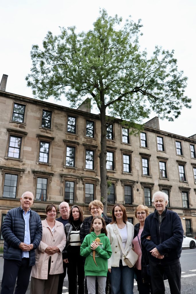 As the story of the tree resurfaced, something remarkable happened. The Lilly family whose ancestors migrated to Glasgow from Ireland, living at number 1223 in the 1930s, saw the campaign online. They returned to visit it, reached out, connected across continents, and shared photographs and memories of the tree.