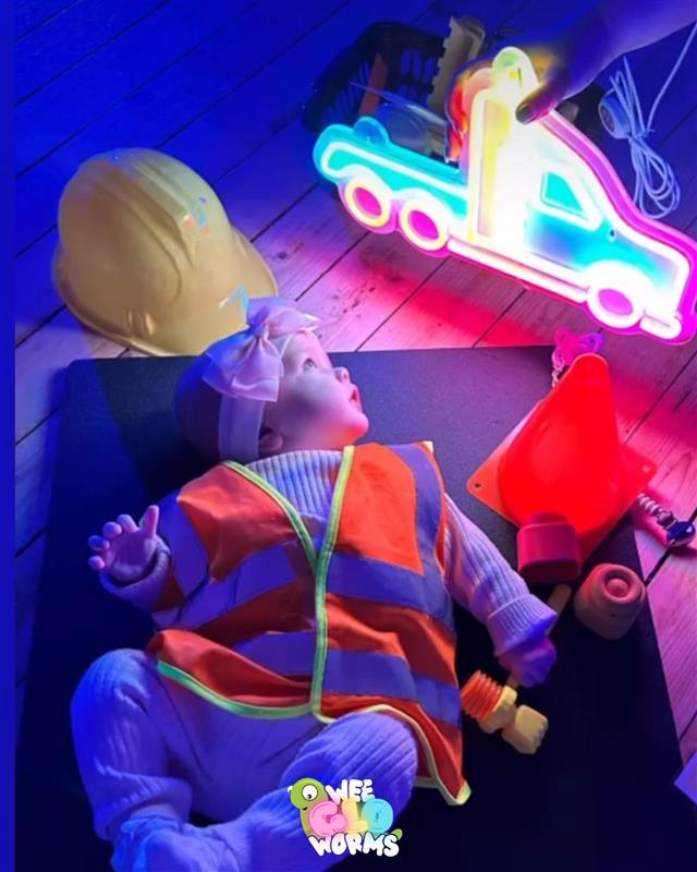 The lights dim, and the sensory effects come to life. Gentle glows, soft sparkles, and twinkling hues transform the space into a neon wonderland. Babies gaze wide-eyed as the star of the show—Wiggles the Glo Worm—awakens to guide them through a joyful, glowing adventure.