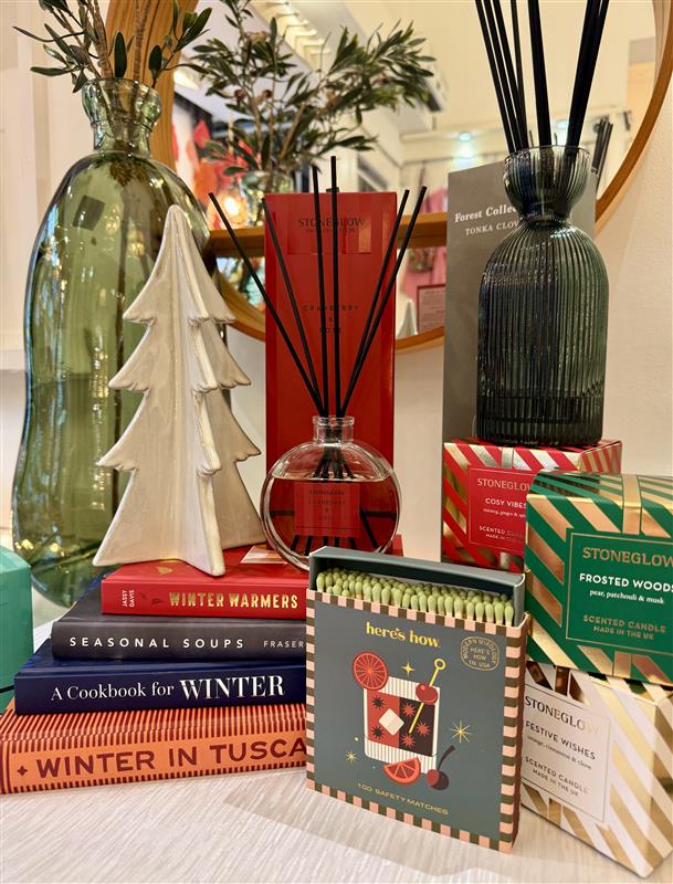 Tall recycled-glass vases in shades of green are filled with simple greenery, while stacks of winter recipe and coffee-table books bring both colour and inspiration. The gentle glow of Stoneglow candles in fragrances like Cranberry & Fig and Festive Wishes adds that soft, welcoming warmth. Oversized matchboxes in bold, graphic designs sit alongside elegant diffusers and small ceramic Christmas trees – it’s a still life of festive joy.