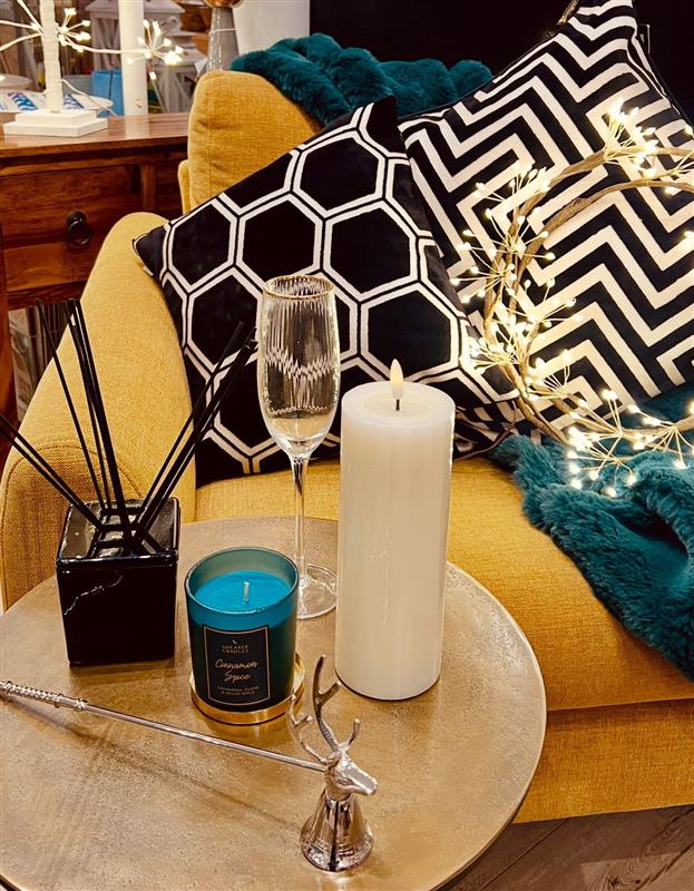 Start with what you already have, a neutral sofa, a favourite chair, your everyday table – and layer in small, thoughtful details. Add texture with a faux-fur throw, bring scent into the room with a candle or diffuser and use cushions, napkins, or even oven gloves as bursts of seasonal colour.