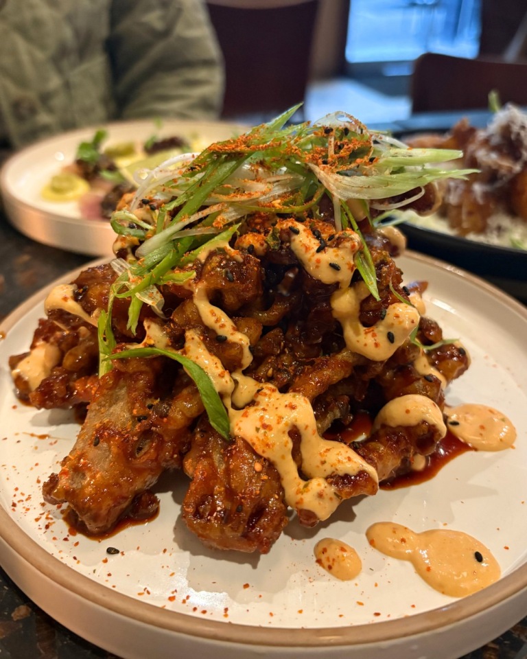Our first taste of what Cottonrake by night had to offer was the gochuchang-glazed shimeji mushrooms, with spring onion, sesame and kimchi mayo. Piled high on the plate, the mushrooms had been deep fried until perfectly golden and crisp, with a meaty texture and a spicy glaze that left us licking our lips in delight.