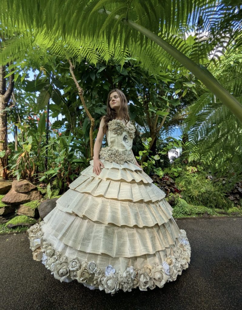The school’s belief in Honor is key to her success and indeed her confidence. Having been unwell as a toddler, Honor has found some areas of her learning difficult. She has dyslexia, dyscalculia and short term memory problems. Yet in her innovation and art class, she excels. Recently Honor created a ballgown styled with hundreds of tiny roses, each taking over 20 minutes to make and all from the pages of books. Modelled by Honor in the Kibble Palace, her dress looks like a piece of Alexander McQueen couture.